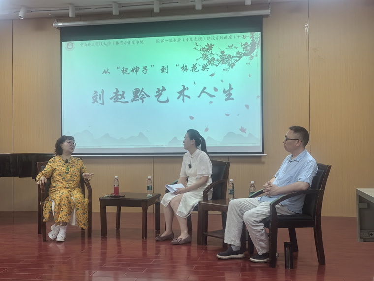 5月21日上午,体育与音乐学院国家一流专业(音乐表演)建设系列讲座第十场在雅乐楼多功能阶梯教室进行,讲座邀请到湖南省花鼓戏国家一级演员、湖南花鼓戏省级传承人、中国戏剧最高奖“梅花奖”、文化部“文华奖”、湖南省“田汉表演奖”得主刘赵黔老师莅临我校,带来了一场题为《从“祝婶子”到“梅花奖”刘赵黔艺术人生》访谈式的讲座。学院党委书记李婷、音乐学科带头人李祖胜教授,学院教师、部分本科生与研究生参加了讲座,讲座由周静老师主持。
