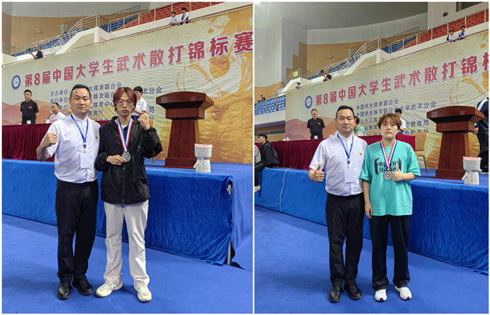 本次比赛既是大学生国内武术散打年度最高级别、最高水平的锦标赛,也是两项国际赛事的选拔赛。我校散打队派出3人参赛,共获得2枚银牌和一个第五名的历史最好成绩。其中,姚青青同学在女子甲A75kg 级的激烈竞争中脱颖而出,斩获亚军殊荣,展现出强大的实力与坚韧的斗志;胡敏杰同学在男子甲 A56kg 级的比拼中表现卓越,荣获亚军,尽显拼搏精神;袁龙齐同学在男子甲 A90kg 级的赛场上奋力拼搏,最终获得了令人钦佩的第五名。我校散打队获“体育道德风尚奖运动队”;三位参赛运动员均取得“体育道德风尚奖运动员”称号;周少文老师获“体育道德风尚奖”教练员。