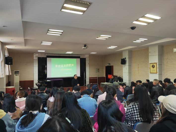 2021年11月22日下午2点30分,为了全面认识湖南地方音乐文化,进一步了解湖南地方音乐在湖南地域间的生成、传播、变化与兴衰,为音乐学院教师申报各级各类研究课题捕捉研究目标,特邀请湖南省艺术研究院研究员、国家一级编剧、湖南省“非遗”专家孙文辉先生到音乐学院开展了一场《来自远古的歌声——非遗中的湖南音乐》的专题讲座,全院教师、研究生和部分本科生到场聆听。