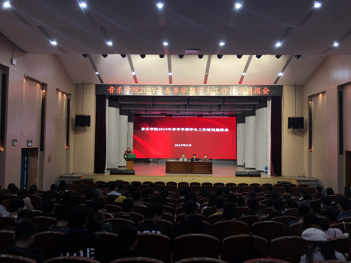 3月28日中午,音乐学院2019年春季学期学生工作情况通报会在雅韵堂召开。本次会议由院长李祖胜主持,党总支书记吴成祥、党总支副书记刘智娟、副院长李闽及各年级辅导员、班主任、全体本科生参加了此次会议。