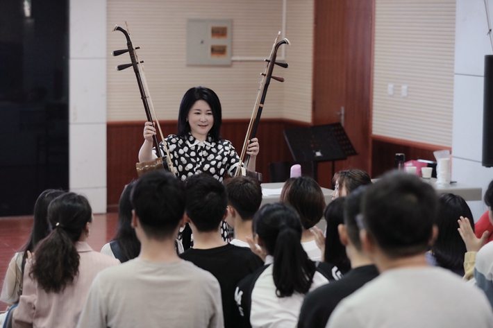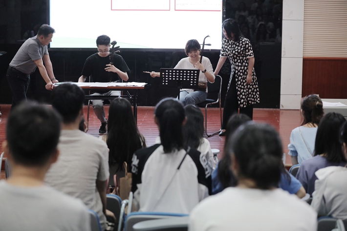 在讲座过程中,蔡霞老师、王勇老师联袂主讲,针对大筒的艺术特征、演奏技巧等方面进行示范教学,并和二胡作了对比分析,让同学们更加清楚的了解了大筒的的构造。讲座形式丰富多彩,通过讲述、哼唱、演奏等形式,让同学们更加生动、鲜活的了解了大筒的魅力。无论是“大筒艺术特征”和“大筒演奏法”的归纳解析,还是花鼓戏小调《洗菜心》,二位老师都一丝不苟,用心、用脑、用情与听众沟通交流,有效地将大筒艺术的知识普及、兴趣引导与技能传授和谐融为一体。随后,中国戏曲表演艺术最高奖“梅花奖”得主叶红登台,在王勇的伴奏下精彩“开唱”,其专业的表演引来台下同学们的阵阵掌声,将整场讲座推向高潮。老师们邀请台下同学上台试奏大筒,并进行一对一指导,使同学们真正近距离的接触并感受大筒。