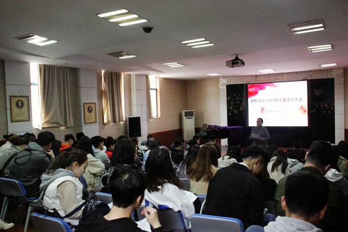 3月15日中午,音乐学院在雅乐楼多媒体阶梯教室召开了2019年学生工作大会。本次大会由辅导员王香甜主持,党总支副书记刘智娟对学院2019年学生工作进行部署和安排,辅导员钟楚鲲、孙志远,以及全体学生会成员、全体学生党员、各年级班干部参加会议。