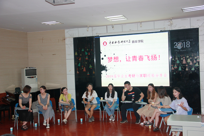 6月19日下午,音乐学院在多媒体教室开展了“梦想,让青春飞扬”2018届优秀毕业生考研与求职经验分享会,本次分享会旨在分享优秀毕业生在学习与生活中的宝贵经验。