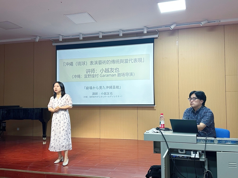 上午,小越友也通过精心制作的影像资料与学术图谱,不仅介绍了日本冲绳当地的传统经济文化、饮食文化、当地习俗与自然环境,还介绍了与中国建立的深厚联系。小越友也着重解析了海岛地理环境对传统艺能形态的塑造作用:从祭祀仪式中诞生的舞踊艺术,到融合说唱、舞蹈、戏剧的"组舞"表演;从以三线乐器为核心的宫廷雅乐,到民众庆典中极具张力的太鼓阵形;从传统音乐到现代音乐的传承与发展,全景式展现了冲绳表演艺术美学特质。