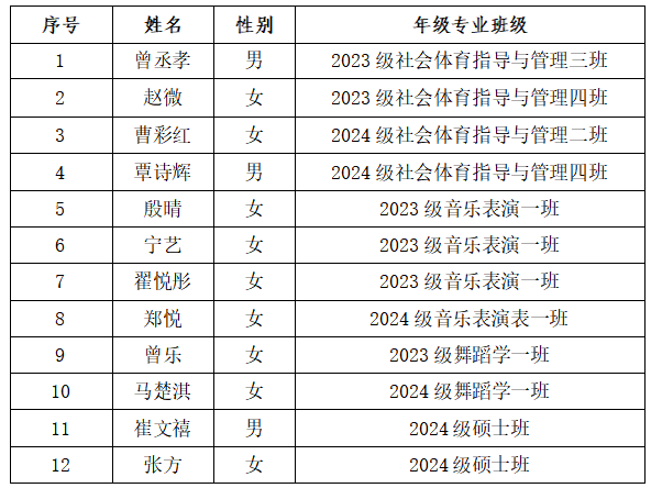 根据《中国共产党发展党员工作细则》和学校、学院党委发展党员工作的要求,经体育与音乐学生党支部1年以上的培养教育和考察,曾丞孝等12位同志基本具备党员条件。经听取培养联系人、党员和群众意见,支委讨论,现将曾丞孝等12位同志列为党员发展对象。为进一步增强发展党员工作透明度,确保发展党员质量,更广泛地接受群众监督,特将拟列为发展对象的名单进行公示。