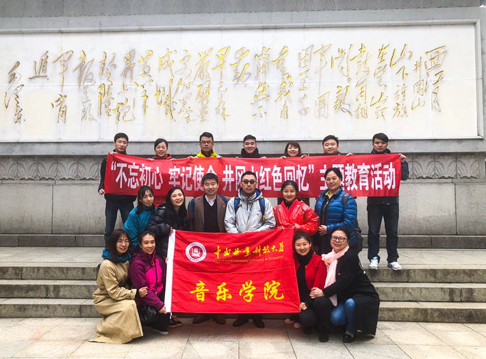 2018年4月13 -15日音乐学院教工党支部全体党员瞻仰革命圣地,学习井冈山精神。追随着革命先烈的脚步,开展为期三天的学习之行。瞻仰了革命烈士陵园,参观了黄洋界哨口、茅坪八角楼、毛泽东旧居、小井红军医院、井冈山革命博物馆。在井冈山革命烈士陵园,全体党员满怀崇敬之情缅怀革命先烈,体会信仰的力量。面向鲜红的党旗,全体党员同志举行了庄严的重温入党誓词活动。