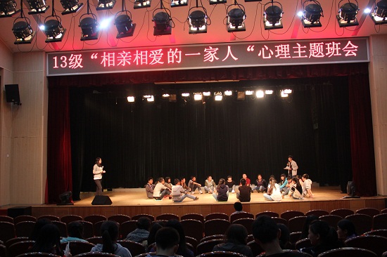 在2013年11月1日晚,我系在音乐厅举行了2013级新生“相亲相爱一家人”心理主题班会。学生会主席李江,常务副书记魏杜鹏到达了现场。心理体育部部长钟芸和文艺部部长蔡明飞共同主持本次心理主题班会。