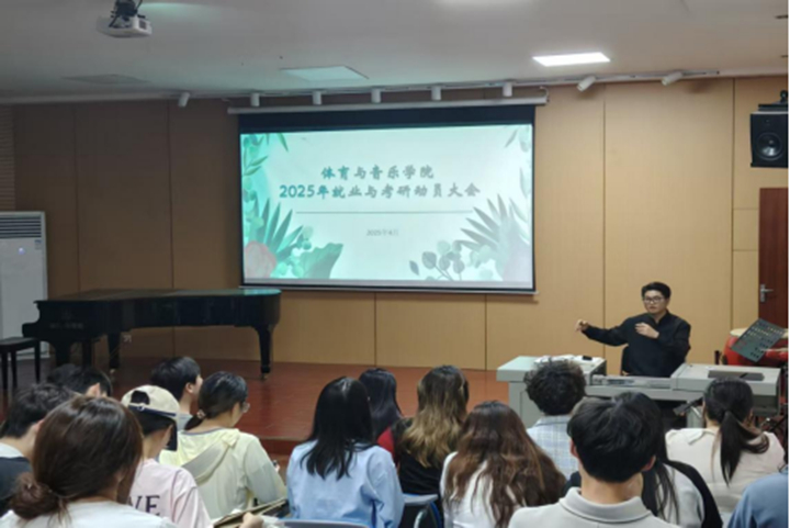 4月17日,学院在雅乐楼109教室召开2025年就业与考研动员大会,会议由音乐表演系主任郭建光主讲,2022级音乐表演系全体学生参加。